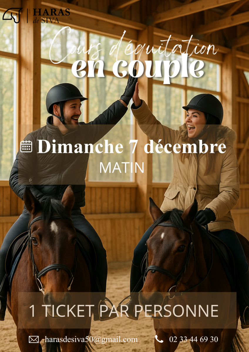 Le Haras de Siva vous propose un moment privilégié à deux : un cours d’équitation en couple le dimanche 7 décembre au matin.